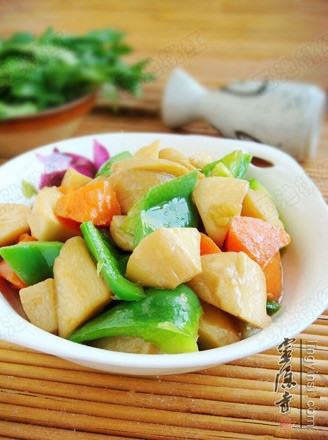 1、杏鲍菇和胡萝卜切滚刀块、青椒切块。