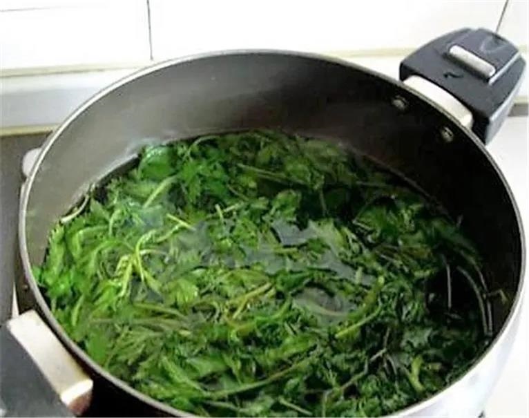 锅中放入开水,沸水后加入少量食盐,然后把艾青焯一下(也可加稍许食用小苏打以固定翠绿色)。