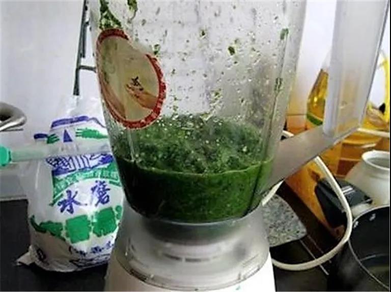 艾草挤去苦水,放在搅拌机里面打成泥糊状。(注意要加适量的水)。