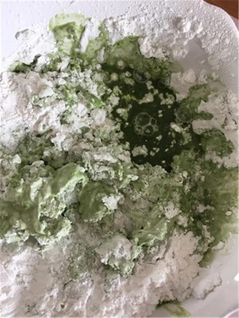 米粉倒进艾青泥里面,加热水搅匀,并放在微波炉里面高温加热1分钟左右(起醒面作用)。