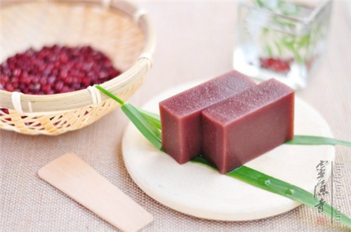 8.食用前,用手轻轻地推挤栗羊羹的一周,就很容易脱模了。