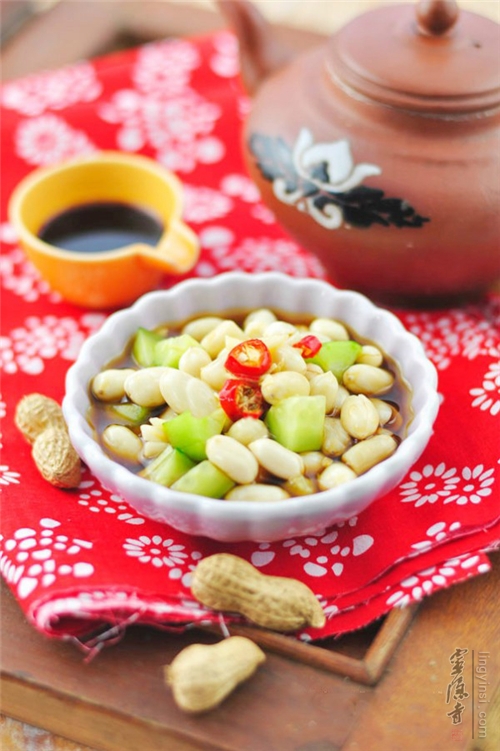 【材料】(三人份):生花生米 200g、黄瓜 1个、清水 适量、鲜红辣椒粒 少许
