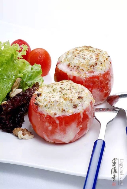 10、生菜、罗沙红生菜,用法式淋汁拌匀,放在盘子一端。旁边用小番茄伴边,最后放入烤好的番茄盅即可。