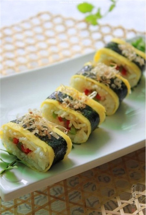 鸡蛋、水煮鸡蛋、 盐、 米饭、 即食海苔、 青红辣椒 、油、 寿司醋、