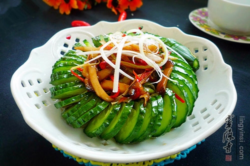 8、腌渍好的黄瓜挤去腌渍出来的汤汁,码放在盘中。