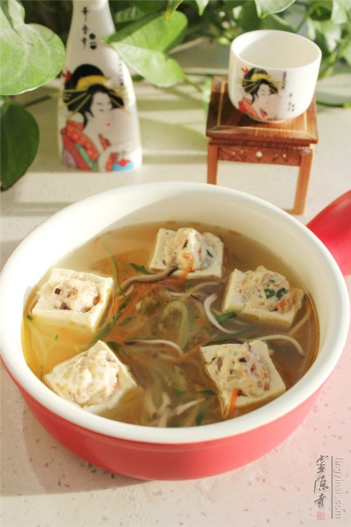 7、将做好的汤慢慢的倒入盛放豆腐盅生坯的容器中。