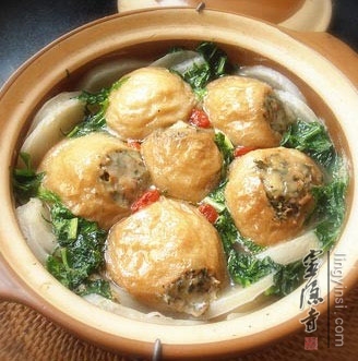 3、将芜菁去皮切成半圆片,叶子切碎备用;瓤好的面筋放入砂锅内,周边填入芜菁片。