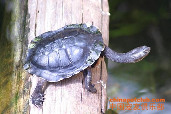 南山公园爬行馆馆长黎龙高告诉记者,这是只长颈龟,主要生长在南方,北方很少见。这只长颈龟可能是有人买来放生到人工湖内的。