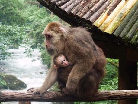 母猴在距离我三米的地方停住,目不转睛的看着我,它的眼睛漆黑如豆。我也看着母猴,从它的眼神中,我并没有感受到死亡的恐惧,它给我更多的感觉是一种脉脉的温情。母猴注视了我大概有半分钟,接下来做出了不可思议的举动,它把自己怀里的小猴子从双手向我递过来。当时我惊呆了,但还是不由自主伸手接过了小猴子。这只小猴子浑身呈粉红色,毛发稀疏,也许它也意识到了危机,既不挣扎,也不反抗,在我手掌里温顺的躺着,一动不动,只有一双漆黑的眼睛,好奇的看着我。