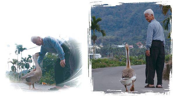 台湾南投县有位务农的黄先生饲养鹅来当宠物,因为他觉得鹅是很通人性又友善的动物。黄先生目前饲养的这只宠物鹅名叫小乖,这只鹅很特别,天天会陪黄先生近八十岁的父亲一起去田间散步,只要黄老先生叫一声:"小乖!"小乖就会从他住的田舍一步一步走过来,并回了一声:"哦!"彷佛在回答说:"来了!"而路过的车辆也会自动放慢速度,让黄老先生、鹅及小黑狗能安心靠边慢行。我们听到小乖的回应声,真的深深感觉到动物是我们的好朋友。