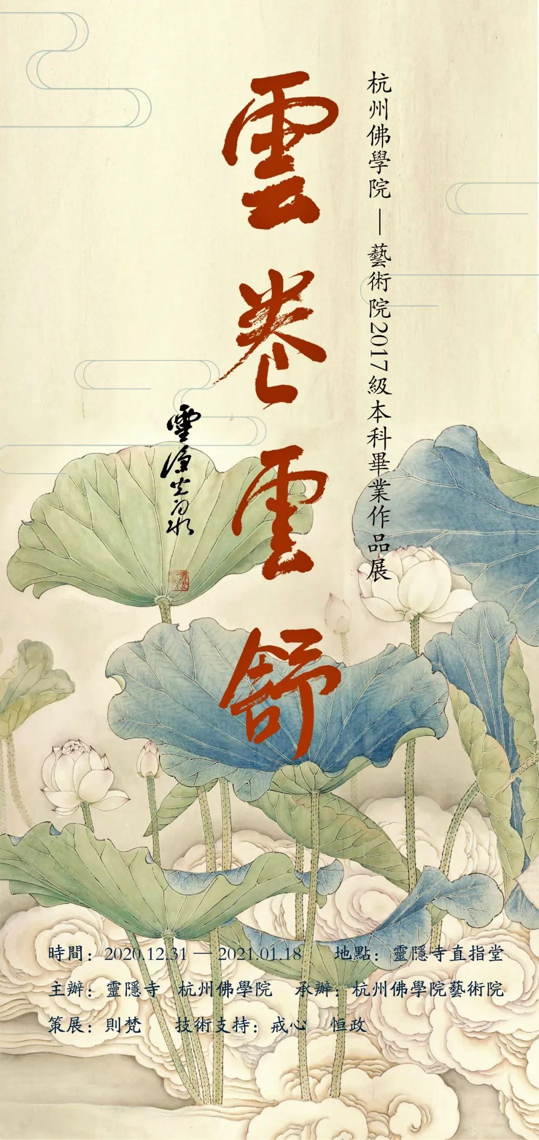 杭州佛学院艺术院2017级毕业展,于2021年1月1日上午十点在灵隐寺直指堂开幕,由院长光泉大和尚题名:云卷云舒,展出毕业作品有人物、山水 、花鸟以及书法作品二百余幅。