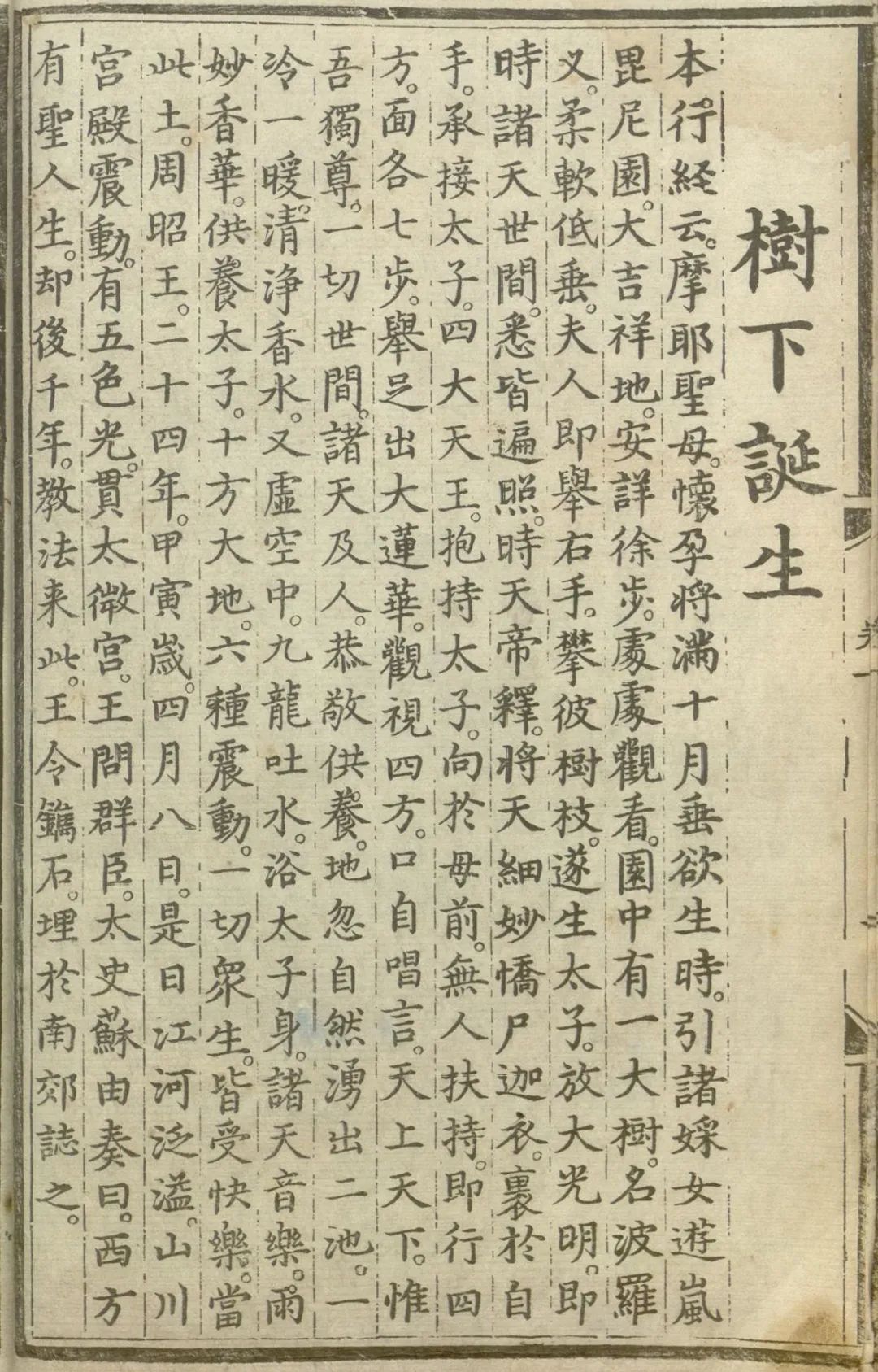 太子诞生之时,正当我国周昭王二十四年甲寅岁四月初八。这一天,江河之水自然澎湃,似欢腾状;山川宫殿震动,空中有五色光芒贯入太微宫。周昭王急问群臣,是何瑞相?有太史苏由奏说:此瑞相主西土有大圣人诞生,千年之后,必有教法传来我国。王即敕令把此事镌记于石,埋在南郊,以备将来考证。