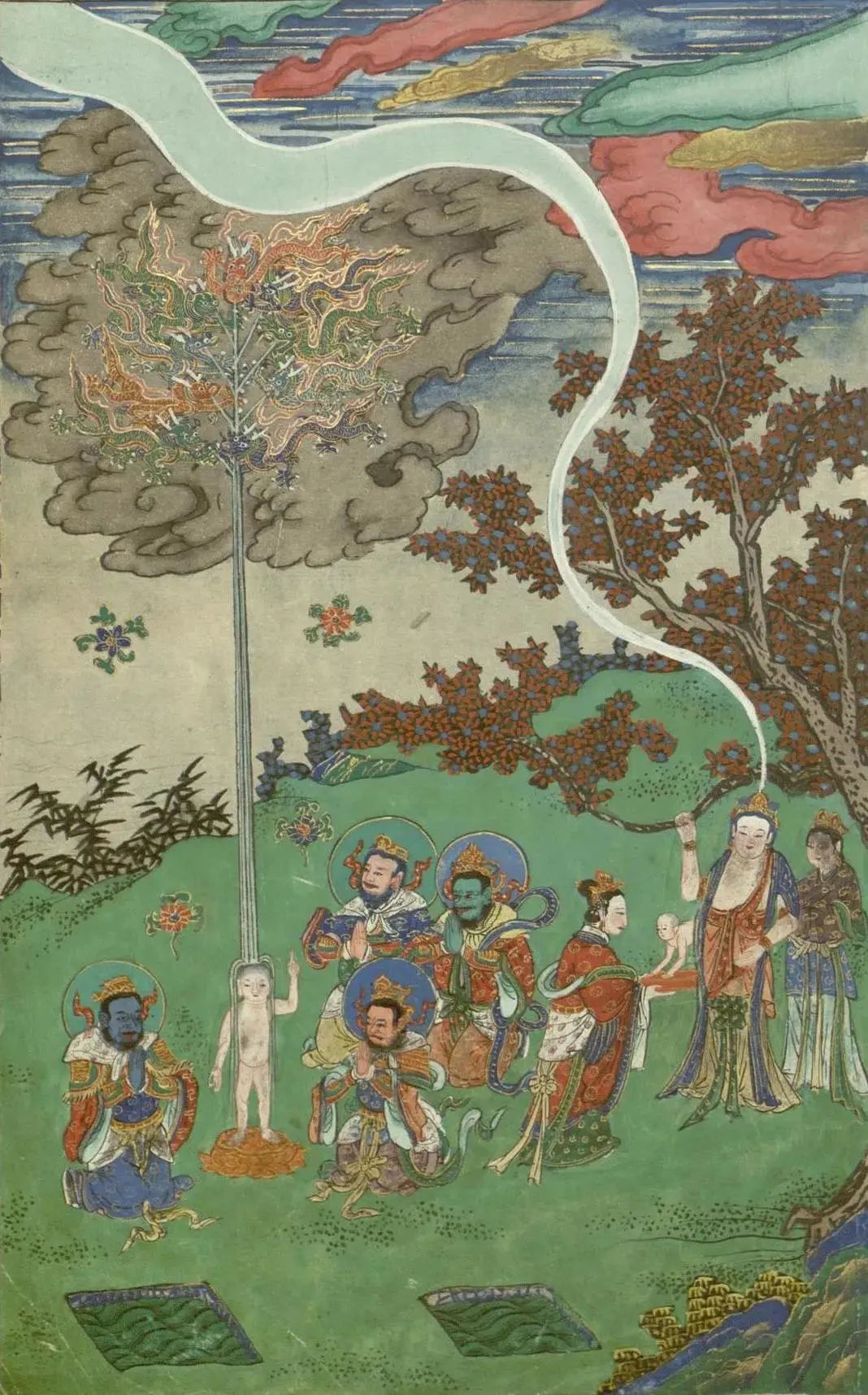 园中有一大树名无忧,花香色艳,枝叶柔软低垂。夫人即举右手攀彼树枝,这时太子遂从右胁而生,全身放大光明,遍照诸天世间。时天帝释以微妙天衣裹手,承接太子。