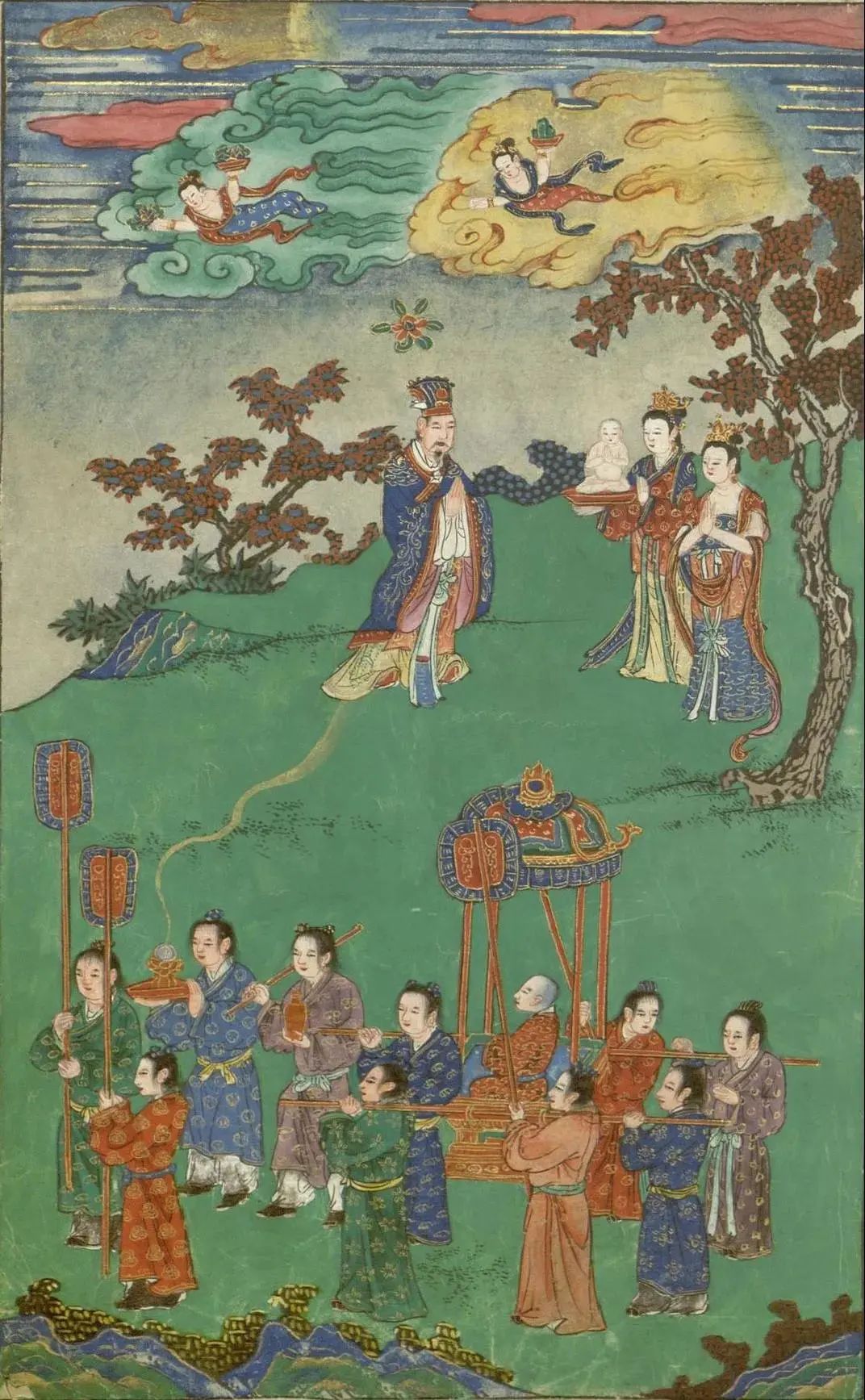 净饭王坐宝殿上。辅相大臣。治理国政。忽闻欢喜鼓声。时王惊问。大臣答言。大王夫人生一太子。形似天人。身黄金色。放大光明。王闻是言。即往园中。欲看太子。