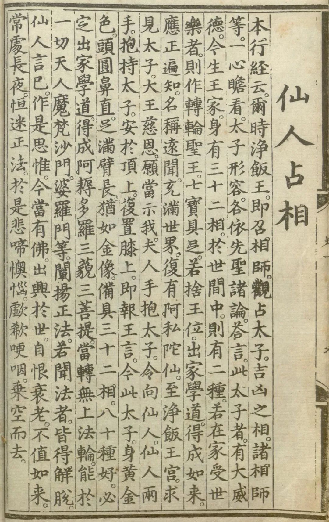 复有阿私陀仙。至净饭王宫。求见太子。大王慈恩。愿当示我。夫人手抱太子。令向仙人。仙人两手抱持太子。安于顶上。复置膝上。即报王言。今此太子身黄金色。头圆鼻直。足满臂长。犹如金像。备具三十二相。八十种好。必定出家修道。得成阿耨多罗三藐三菩提。当转无上法轮。能于一切天人。魔梵沙门婆罗门等。阐扬正法。若闻法者。皆得解脱。