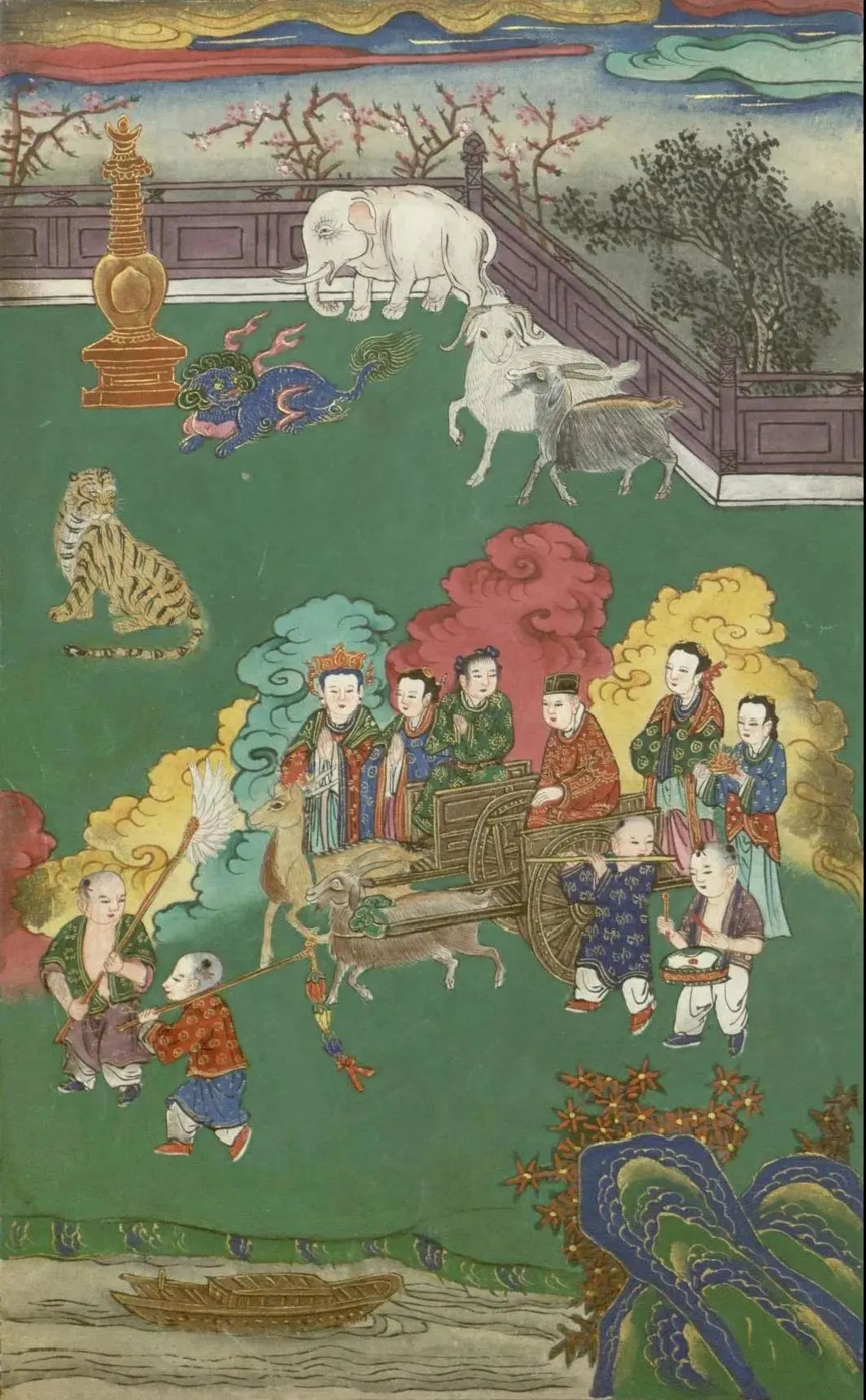 《本行经》上说:当时净饭王特令巧匠制作众宝璎珞、胜妙花鬘、宝冠腰带等,用以庄严太子。姨母摩诃波阇波提常常抱着太子,坐宝辇中。有无数童男童女装束整齐,手执各种鲜花,引导其前,一起来到游乐园中。