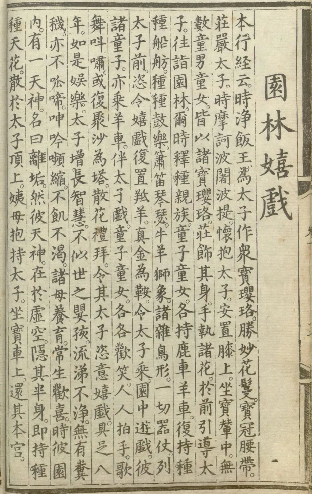这座园林原名无垢清净庄严。园中布置有各式各样的车轮、船舫,各种各样的锣鼓乐器,还有形形色色可爱的小动物;遍地绿草鲜花,到处莺歌燕舞,景物幽雅而壮观,令人赏心悦目,留连忘返。太子伴着许多童男童女于中恣意游玩嬉戏,或唱歌跳舞,或聚沙为塔,或散花礼拜,孩子们的欢声笑语遍满整个园林。太子就在这样的童年世界中度过了八年,并在娱乐中不断启发了灵感,增长了智慧。虽在幼年,却已有超凡的气质,不像其他的小孩或哭闹淘气,或流涕不净,饭食适中而止即能不饥不渴。因此,凡是养育太子的奶妈保姆,都很欢喜。