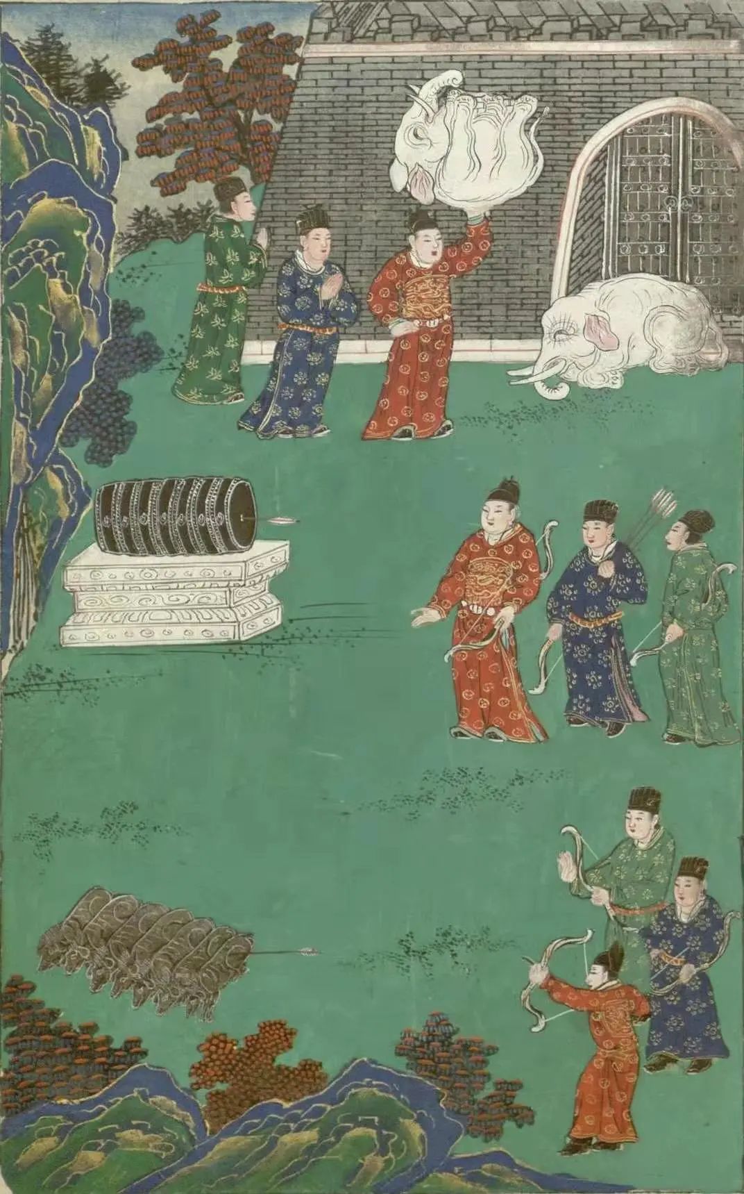 于戏场中安施铁鼓。提婆达多。射彻三鼓。难陀即射。亦彻三鼓。有司进弓。太子试弓。以弓力弱。令取内库祖王所用良弓。太子牵挽平胸。而射一箭。穿过七个铁鼓。其箭射达十拘卢奢。