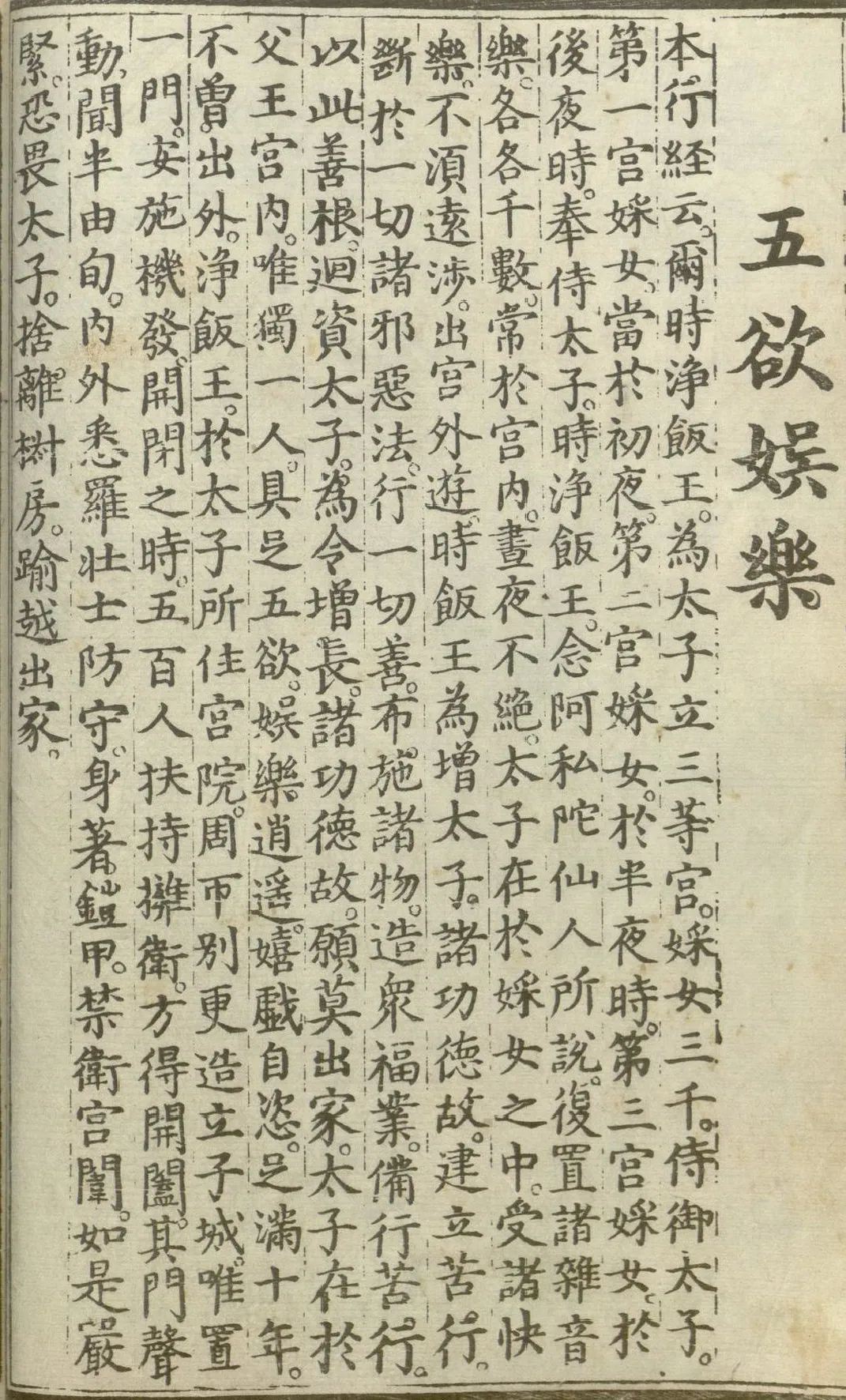 太子在于父王宫内。唯独一人具足五欲。娱乐逍遥。嬉戏自恣。足满十年不曾出家。