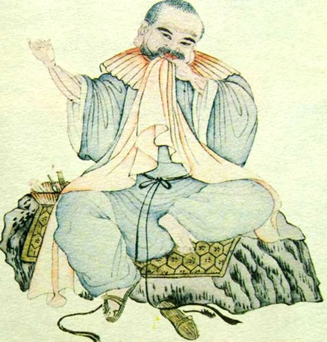 尊者法相所现为悠然而坐,捉巾缝补,左腿赤脚盘于座上,左手执巾于嘴,右手执针外拉,正欲咬断线。