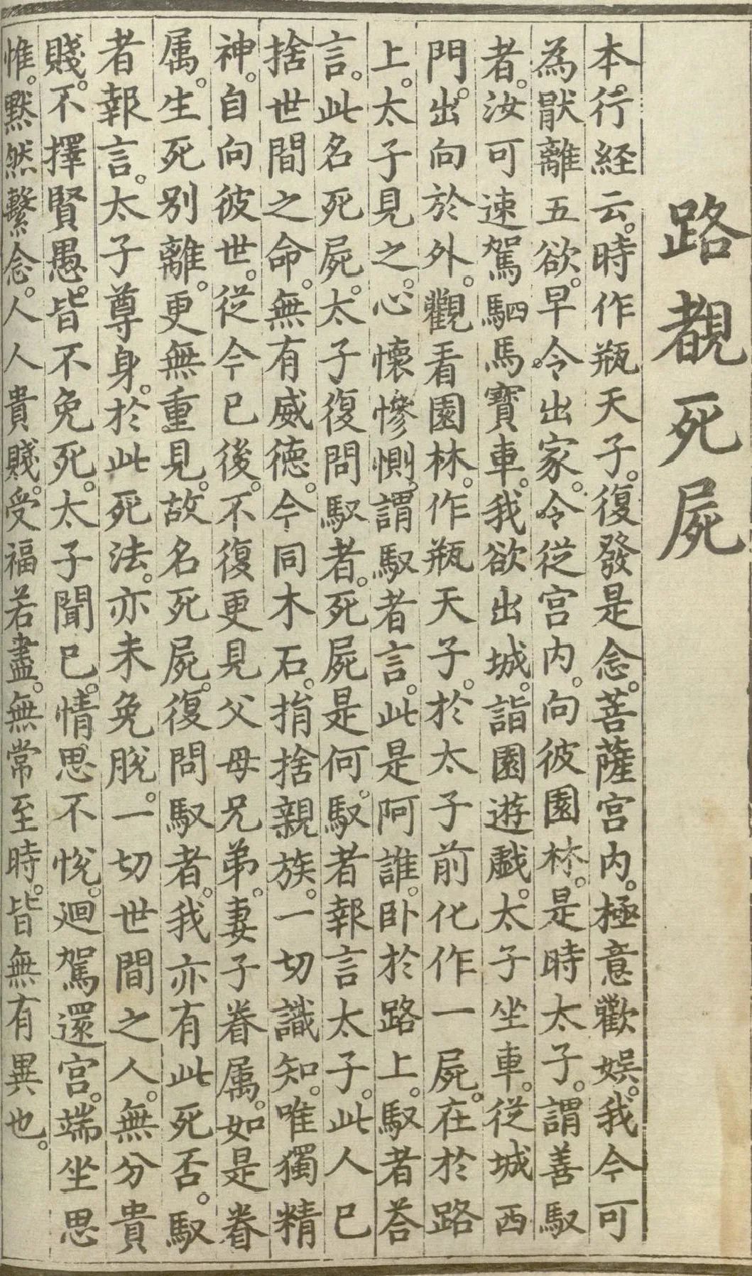 太子见之。心怀惨恻。谓驭者言。此是阿谁。卧于路上。驭者答言。此名死尸。太子复问驭者。死尸是何。驭者报言。太子。此人已舍世间之命。无有威德。今同木石。捐舍亲族一切识知。唯独精神自向彼世。从今已后。不复更见父母兄弟妻子眷属。如是眷属生死别离。更无重见。故名死尸。复问驭者。我亦有此死否。驭者报言。太子尊身。于此死法亦未免脱。一切世间之人。无分贵贱。不择贤愚。皆不免死。