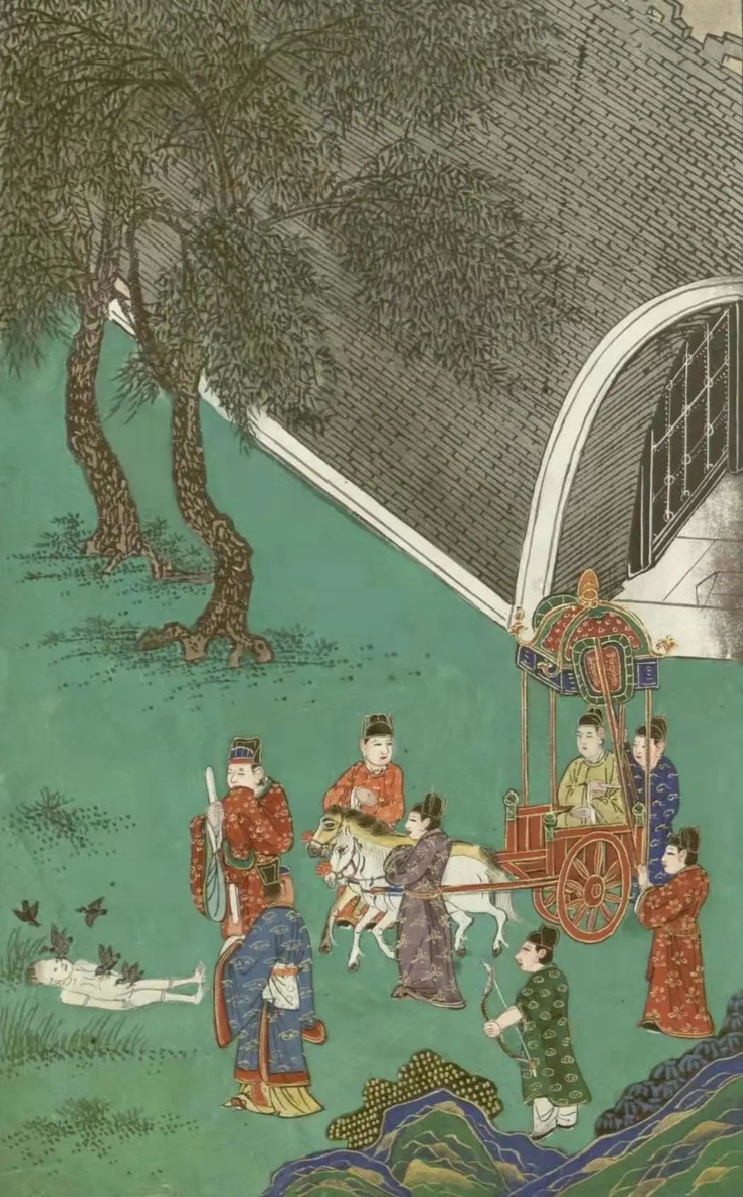 其时,作瓶天子于太子前,化作一死尸,卧于床上,由众人抬着走;家亲眷属,围绕哭泣,十分悲怆。