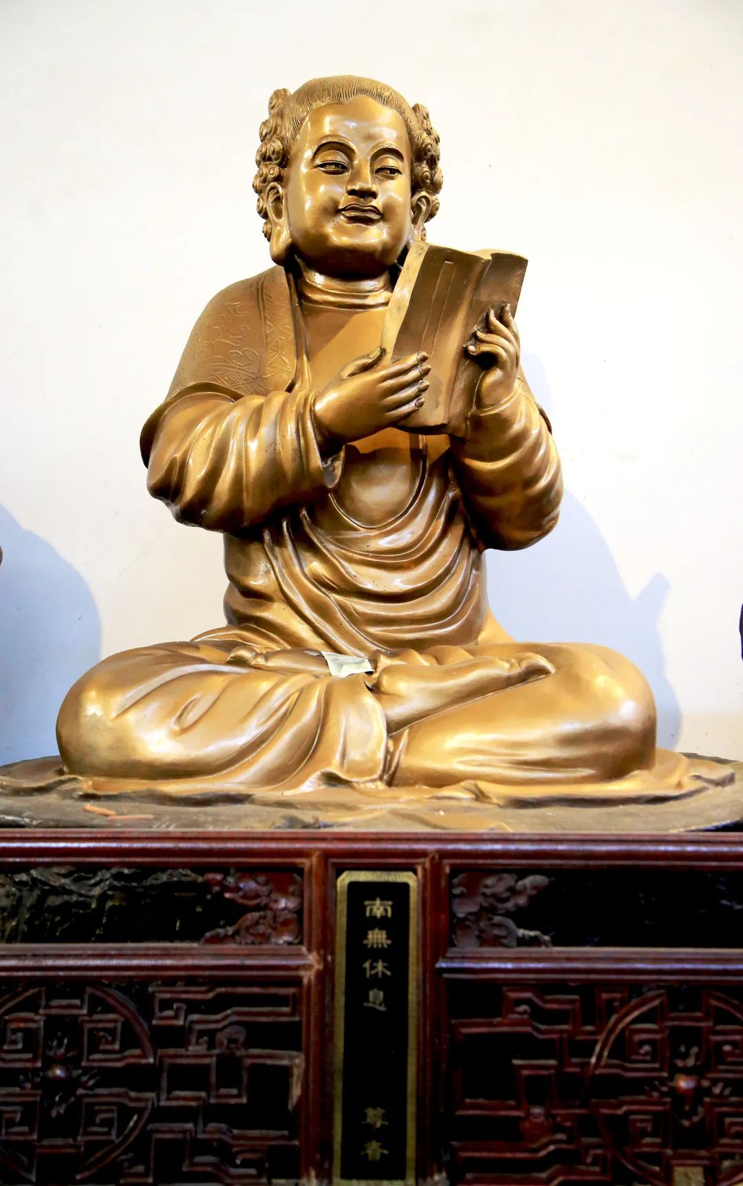 尊者法相所现为结跏趺坐,肩披挂络,双手捧书,专心阅读,神情专注,神态安静祥和。尊者心神宁静,精进修行,能使思维集于一处而不散乱。