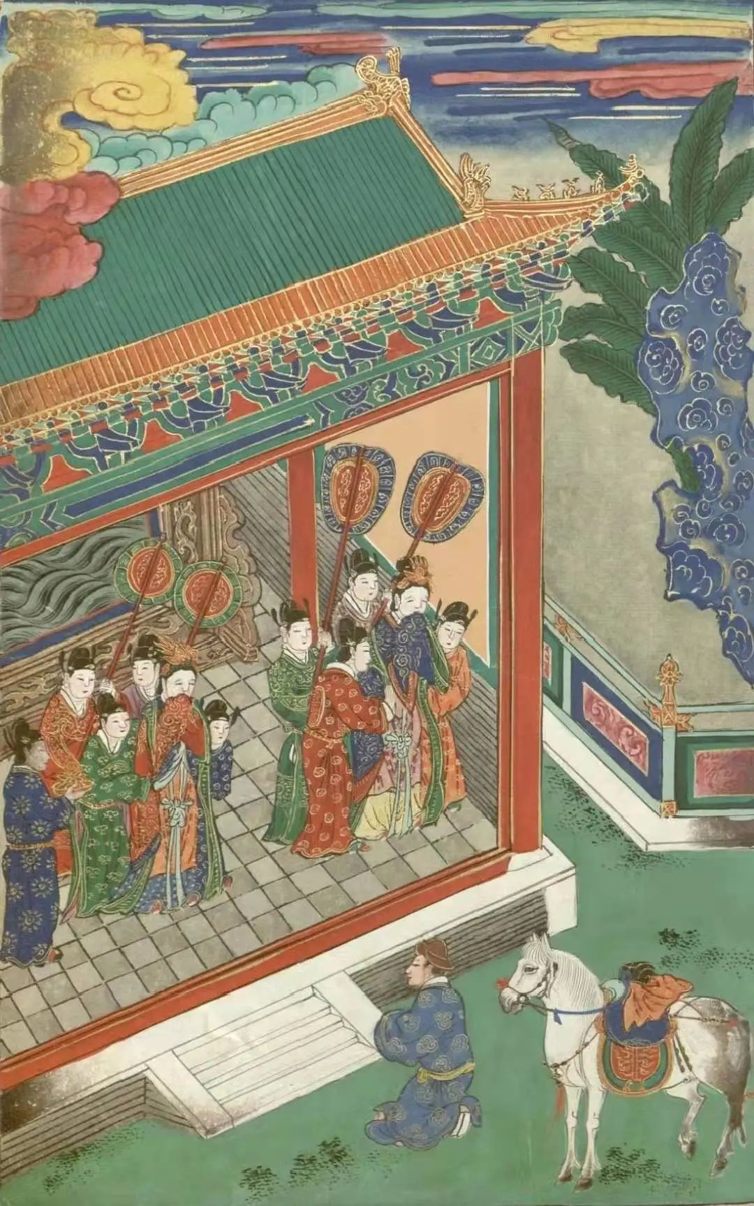 《大庄严经》上说:当时车匿牵着白马,带着包袱,无精打采地回到王宫。这时白马嘶声闻于宫内,摩诃波阇波提及耶输陀罗并诸彩女皆来聚集,她们都怀着一线希望,莫非太子回心转意回宫了。
