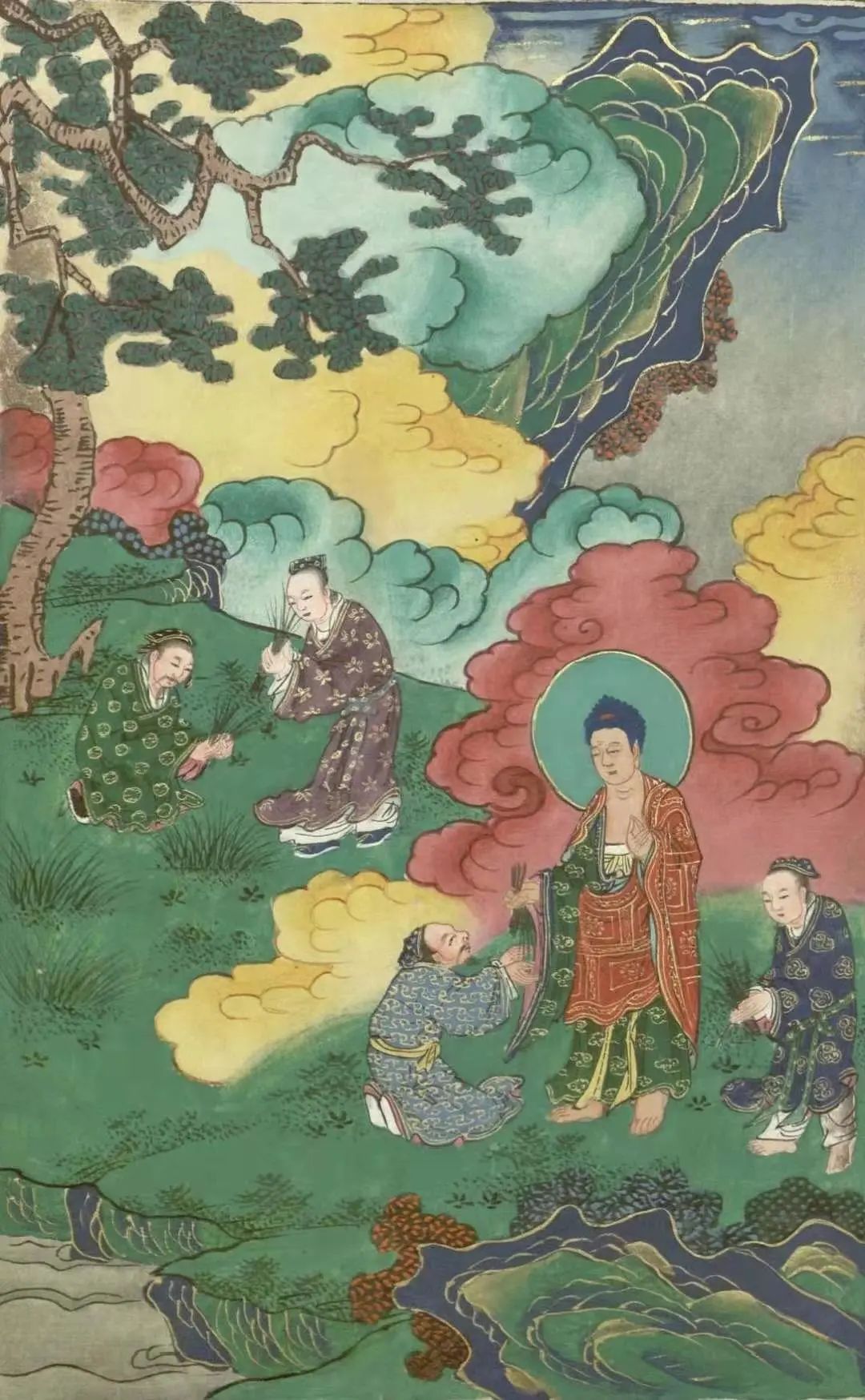 帝释天王心知其意,就化身为一个割草人,在离菩萨不远的地方割草。他割的草青翠碧绿,颜色犹如孔雀项毛,柔软滑泽;用手触摸,就好像微细轻柔的迦尸迦衣,色妙清香。