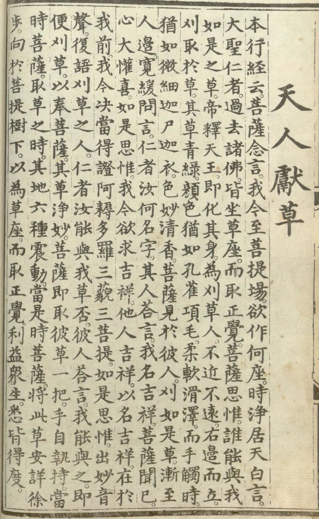 帝释天即化其身。为刈草人。不近不远右边而立。刈取于草。其草青绿。颜色犹如孔雀项毛。柔软滑泽。而手触时。犹如微细迦尸迦衣。色妙清香。