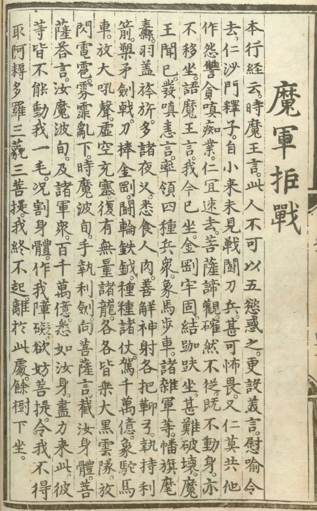 本行经云。时魔王言。此人不可以五欲惑之。更设美言慰喻令去。时魔波旬。仁沙门释子。自小来未见战斗。刀兵甚可怖畏。又仁。莫共他作怨仇。贪瞋痴业。仁宜速去。