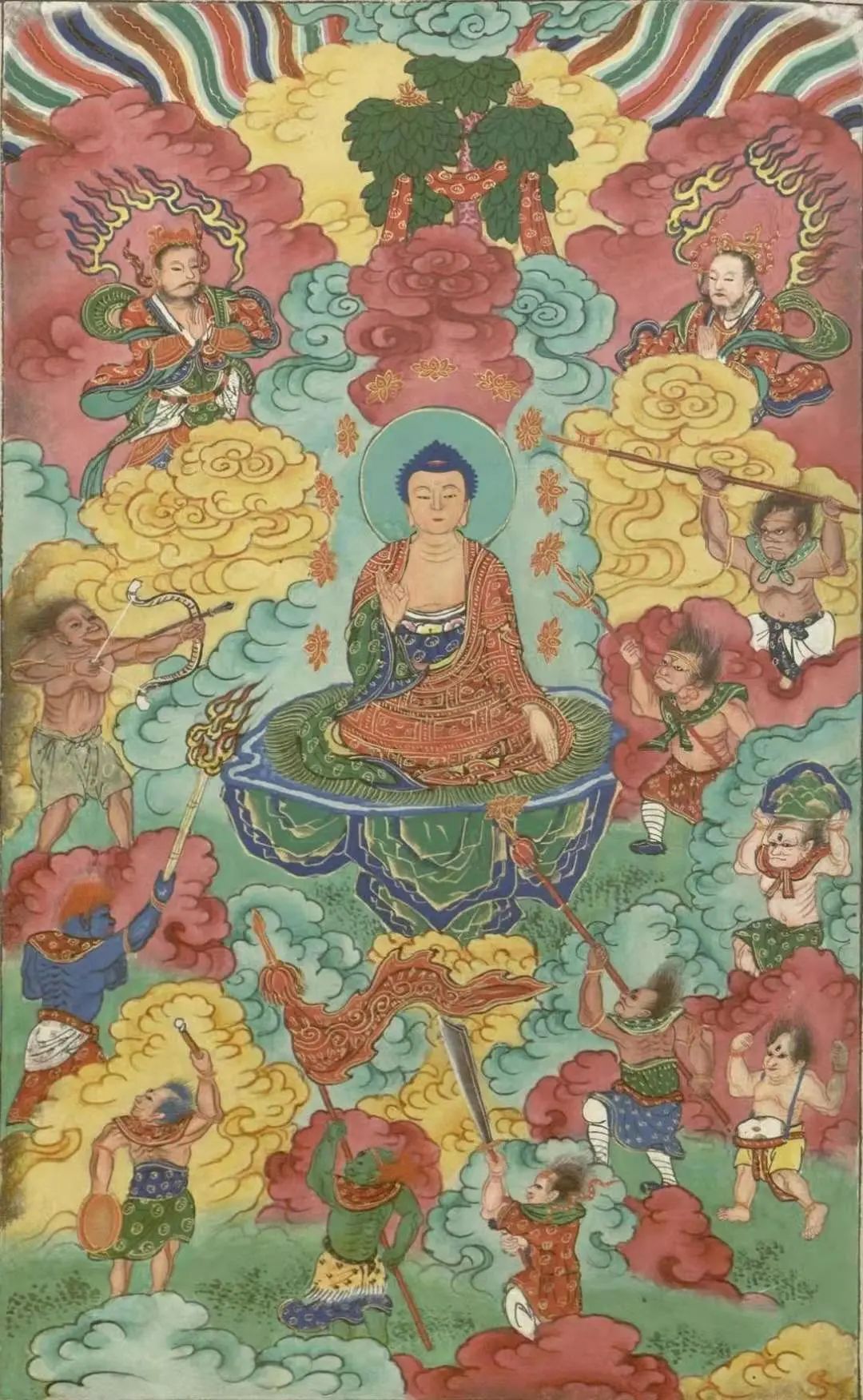 魔王一边说着,一边睨着眼察看菩萨神色。只见菩萨神态安然,既不动身,也不移座,对魔王说:“我今于此结跏趺坐,有如金刚牢固,凭你怎么说怎么做,都休想破坏我的道念。”