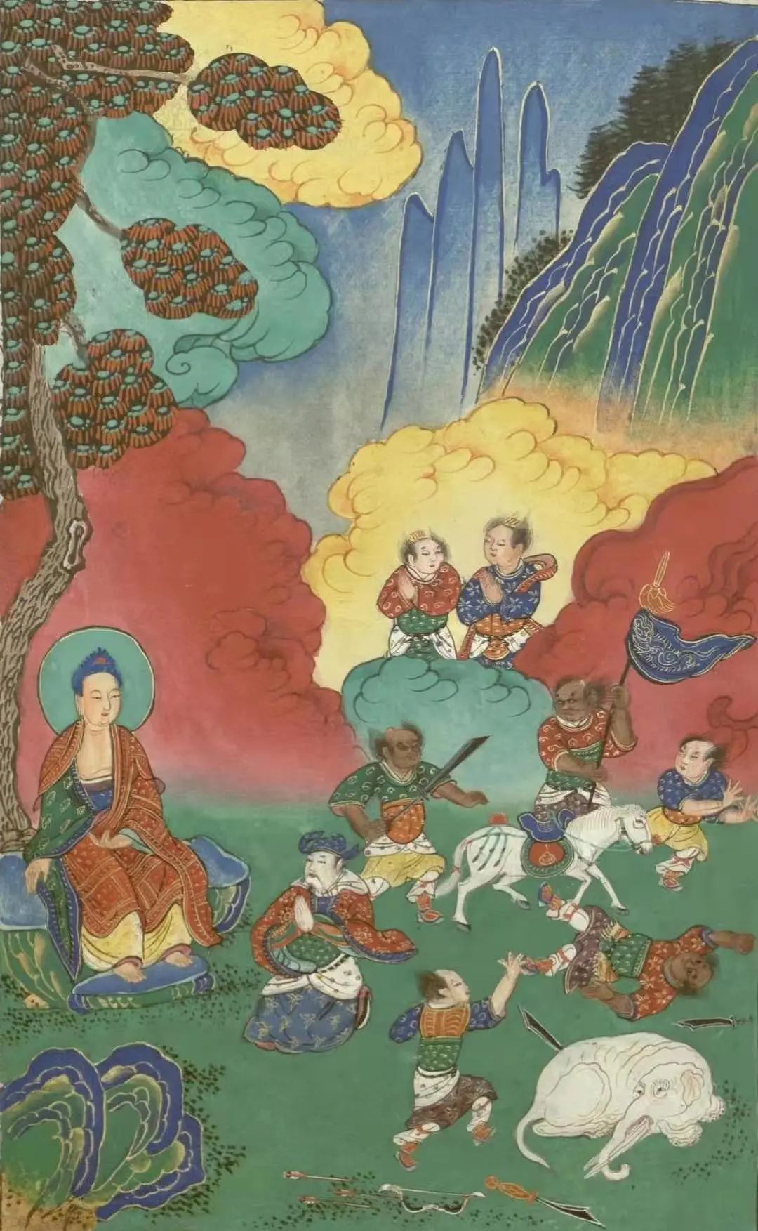 吓得魔王军众心胆皆裂,恐惶不安,自知无法与菩萨相抗衡,悉皆退散,各自逃命。魔王属下的所谓象马车兵四种精锐部队这时溃不成军,大象顿蹶而倒,战马乏卧不起,车辆破裂断折;步兵各弃兵器,丢下战袍,狼狐逃窜,或自覆其面,或伏地装死,或走投深山,或钻入地穴,个个心慌意乱,迷失本性。