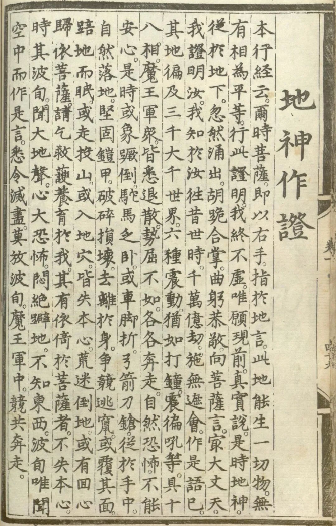 是时地神从于地下忽然涌出。胡跪合掌。曲躬恭敬。向菩萨言。最大丈夫。我证明汝。我知于汝往昔世时。千亿万劫施无遮会。作是语已。其地遍及三千大千世界。六种震动。犹如打钟震遍吼等。如前所说。具十八相。