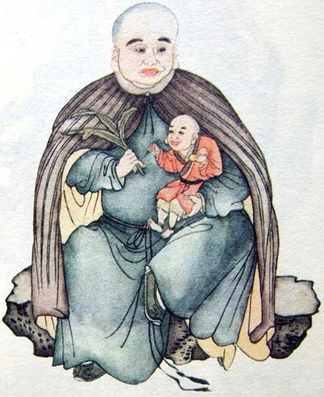 尊者法相所现为安然静坐,左腿盘于座上,左手托童子,右手执叶,眉目俊秀,慈祥和善,体形丰隆。