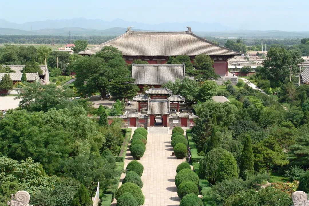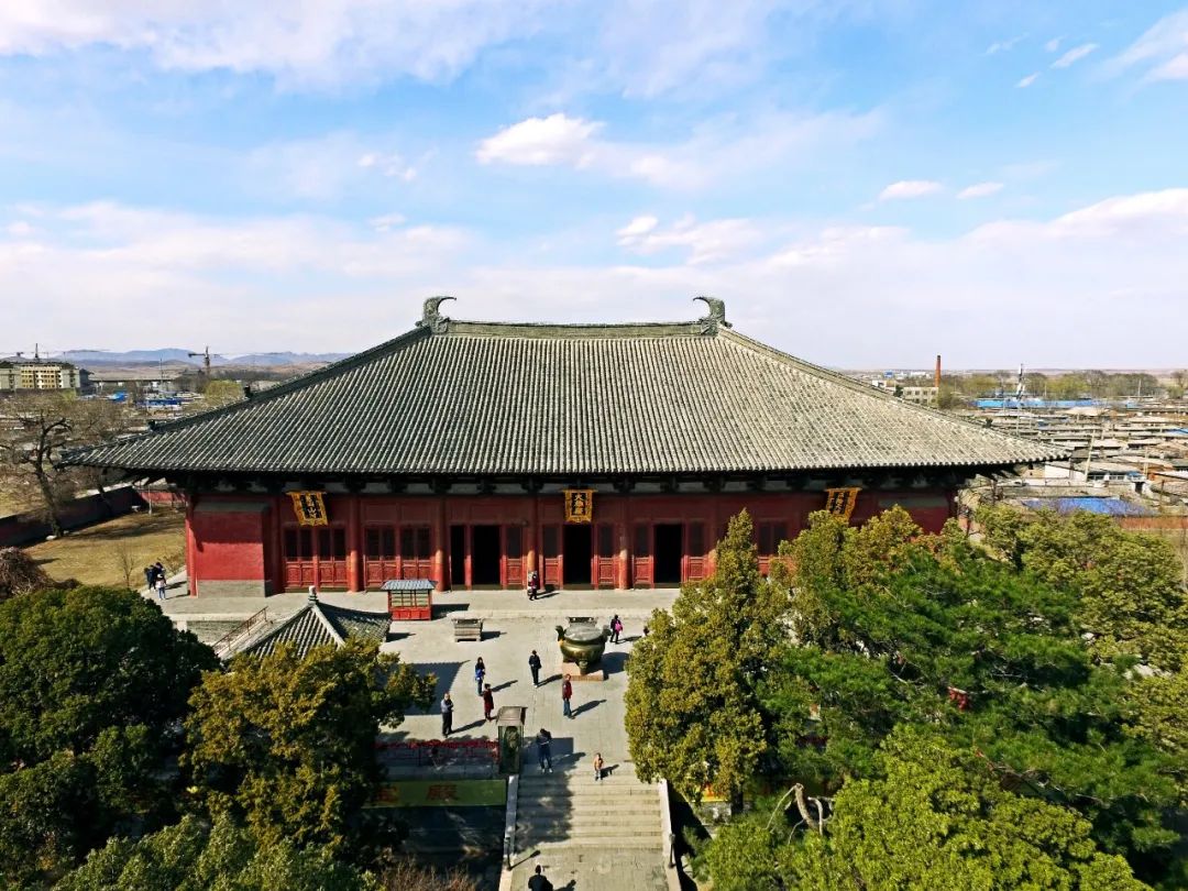 义县奉国寺的大雄宝殿是我国仅存的“八大辽构”之一,殿堂建于辽开泰九年(1020),面阔九间(49.5米)、进深五间(26.6米)、通高19.9米。总面积达1317平方米的大雄宝殿踞于3.2米高台之上,斗拱硕大、气势恢宏。