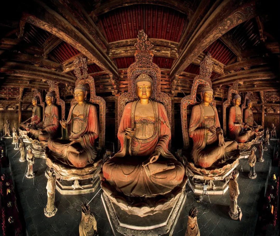大殿中的七尊佛也被称为“过去七佛”,在娑婆世界成住坏空的循环往复中,每每有佛应世教化,《长阿含经》中便记载了七佛出世的因缘。以“过去七佛”为题材的艺术作品也随着佛教东传在东土的石窟中经常出现。但是向奉国寺中如此巨大体量的佛像,乃至以七佛并列供奉的殿堂在中国也都是非常少有的。结合寺院由皇家敕建的身份以及大雄宝殿“九开间”的最高建筑规制推断,这又极有可能是依照“人王即是法王”的观念,以佛教中的“过去七佛”对应自辽德祖以来辽太祖、辽太宗、辽世宗、辽穆宗、辽景宗直至辽圣宗共七位皇帝。