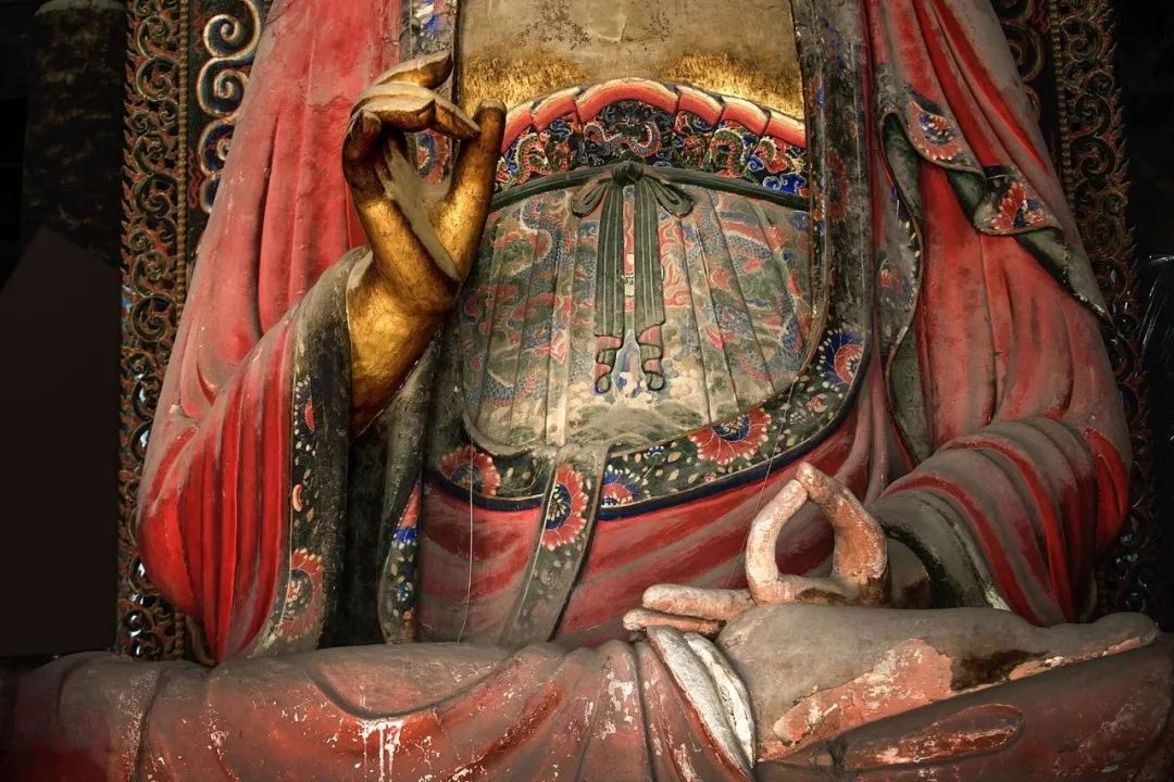 与之相对应的,是最西侧象征寺院修建时在位的辽圣宗本人的释迦牟尼佛像也与其他“六佛”略显不同。其他几尊佛像均内着上锈龙纹的花裙、袒露胸部,裙带于胸部正中结结下垂,外敷绣有花纹边饰的朱色大衣;但释迦牟尼佛像却仅着袈裟、不着内裙,偏袒右肩,头微微转向右侧。史称这位皇帝对佛教“皆洞其旨,尤留心释典”,连他的名字都叫作“文殊奴”。
