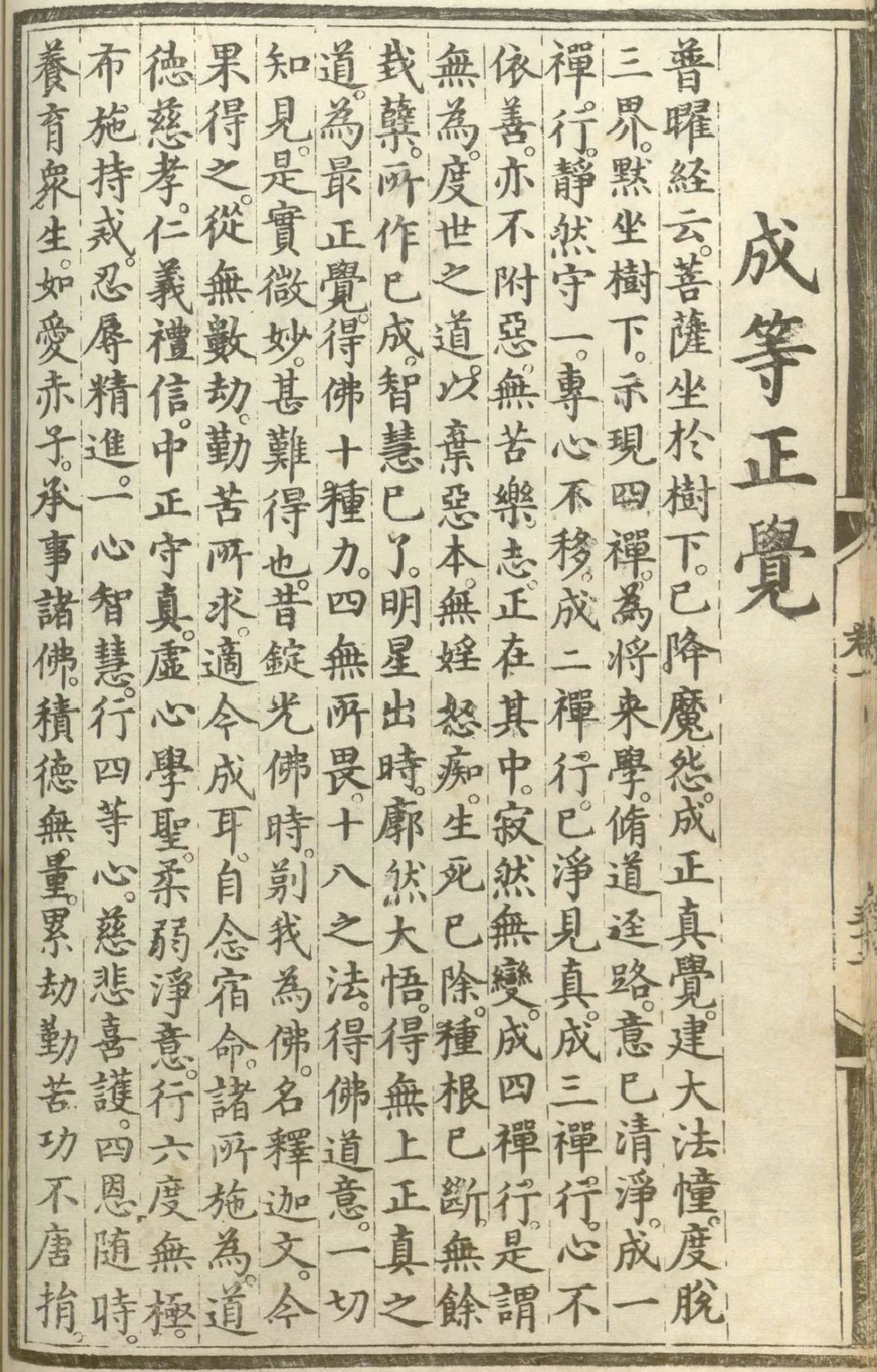 《普曜经》上说:菩萨坐于菩提树下,以坚强不屈的意志,降伏了魔怨,终于成就了正真觉。于是建大法幢,昭示即将度脱三界一切众生;默坐树下,示现四禅,为将来学道者修行径路:意以清净,成一禅行;静然守一,专心不移,成二禅行;以净见真,成三禅行;心不依善,亦不附恶,中外俱净,表里无垢,正在其中,寂然无变,成四禅行。已得定意,建立四无量心,行三十七道品,是谓无为度世之道。菩萨自知已弃恶本,无淫怒痴,烦恼已断,生死已除,一切功德圆满究竟,无所欠缺,所作已办,于明星出时廓然大悟,得无上正真之道,为最正觉。佛十种神力、四无所畏、十八种不共之法,一时俱得。若论佛道境界,微妙难知,高而无上,广不可极;渊而无下,深不可测;大包天地,细入无间。