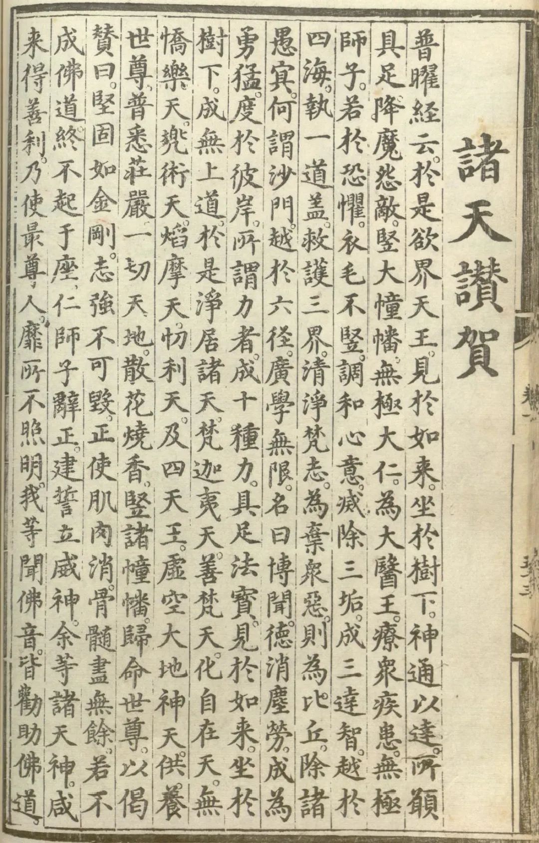 于是净居诸天。梵迦夷天。善梵天。化自在天。无憍乐天。兜术天。焰摩天。忉利天。及四天王。虚空大地神天。供养世尊普悉庄严。一切天地。散花烧香。竖诸幡盖。归命至尊。以偈赞曰。