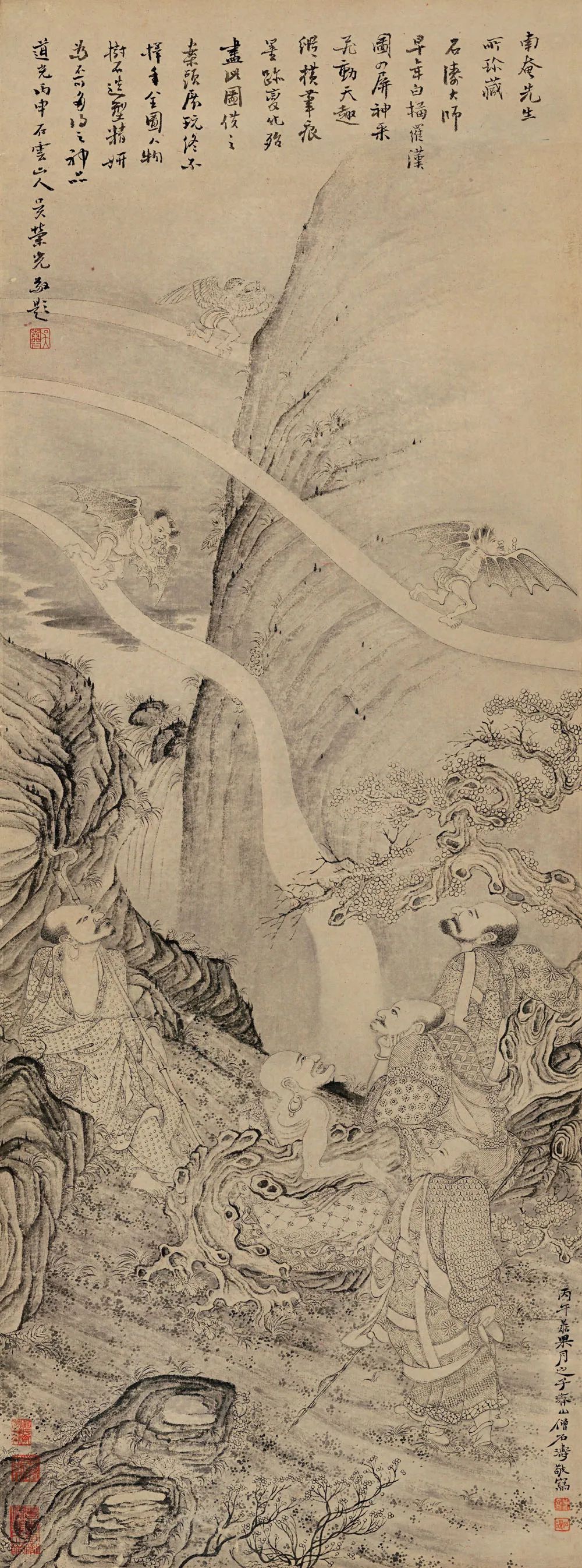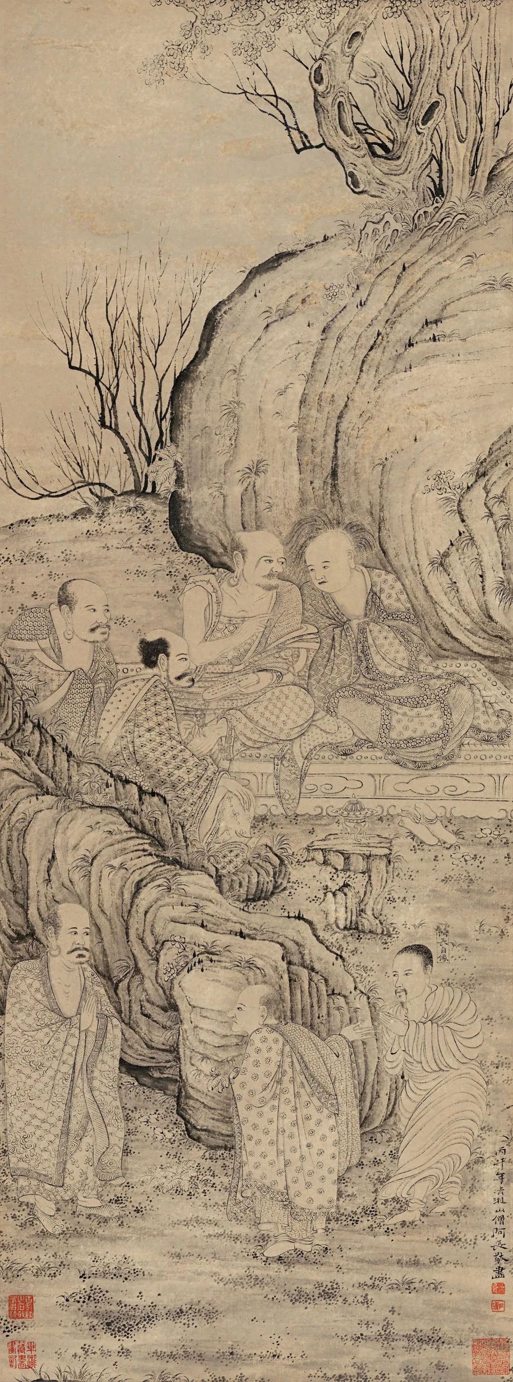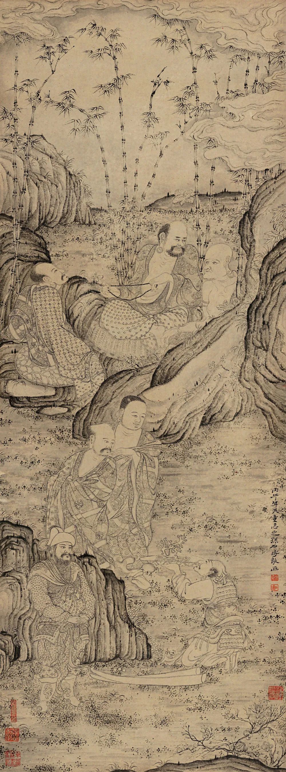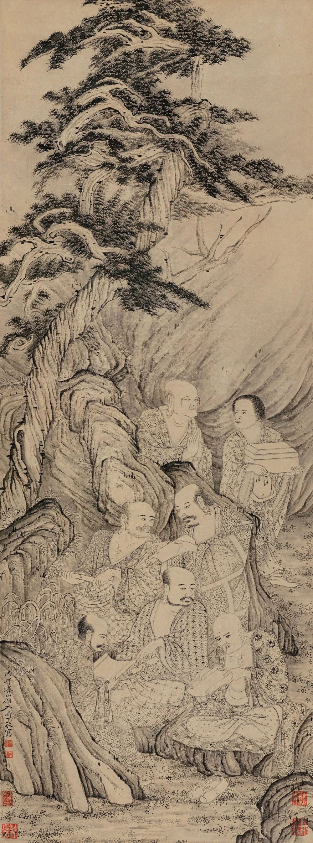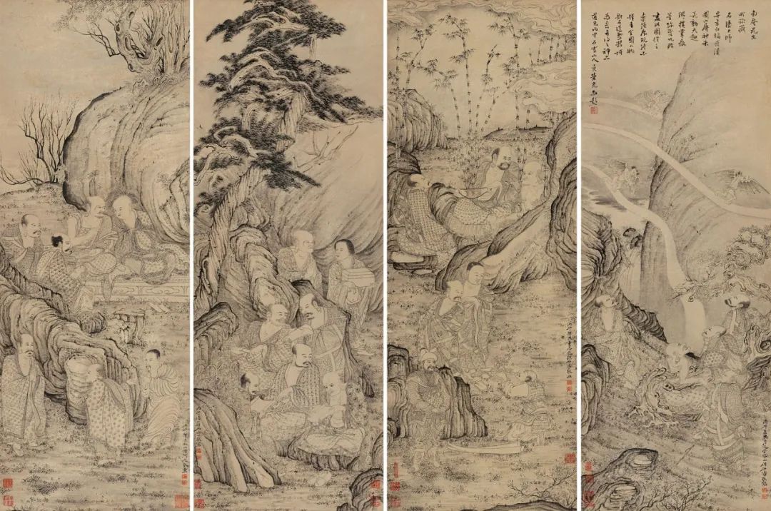 另依据款识时间及绘画内容判断,大都会博物馆藏的《十六阿罗汉应真图》卷、《百页罗汉图》册页、《莲社图》卷的人物面目、服饰、神态,树木、山石的画法,都是以本四屏为参照的,应为以上三本的祖本,具有开宗之意义。