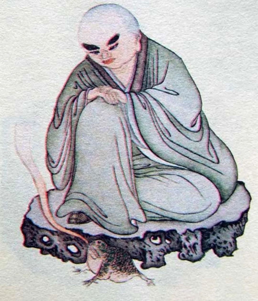 尊者法相所现为寂然静坐,右脚高架于座上,双手合抱右膝,圆头圆脸,神态纯真,目视神蛙。尊者精研佛法,勤于禅定,慈悲助人,行善无数,功德无量。