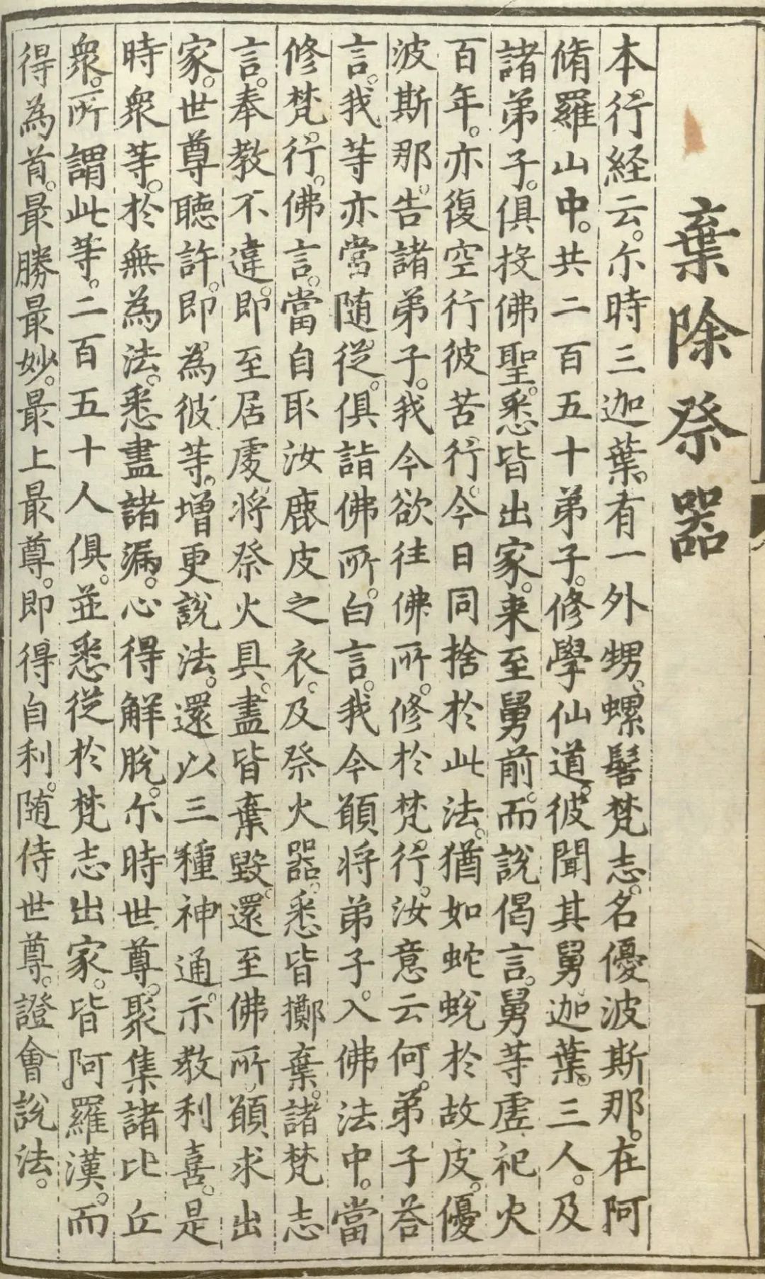佛说:“你等既要修学正法,应把身上鹿皮衣及祭火器,悉皆掷弃。”众梵志说:“谨遵所教,我等奉行不违。”即回居处,将所有祭火器具,尽皆弃毁。然后还至佛所,愿求出家。