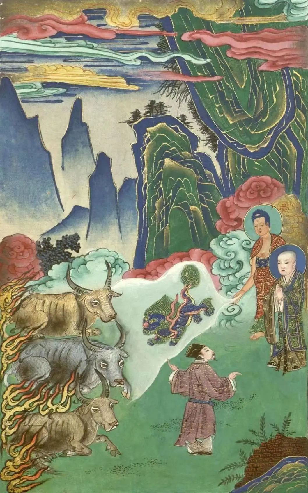 话音刚落,只见恶牛翘尾低角,怒吼狂奔而至。世尊停立不动,于五指端化五狮子在佛左右,周围四面有大火坑。水牛一见狮子和火坑,甚大惶怖,四向驰走,无所逃窜。唯佛足前,有一片空地,晏然清凉,水牛驰奔趋向,当下心意泰然,无有怖畏,即长跪伏首,舔世尊足,又抬头仰视世尊,似乞求状。