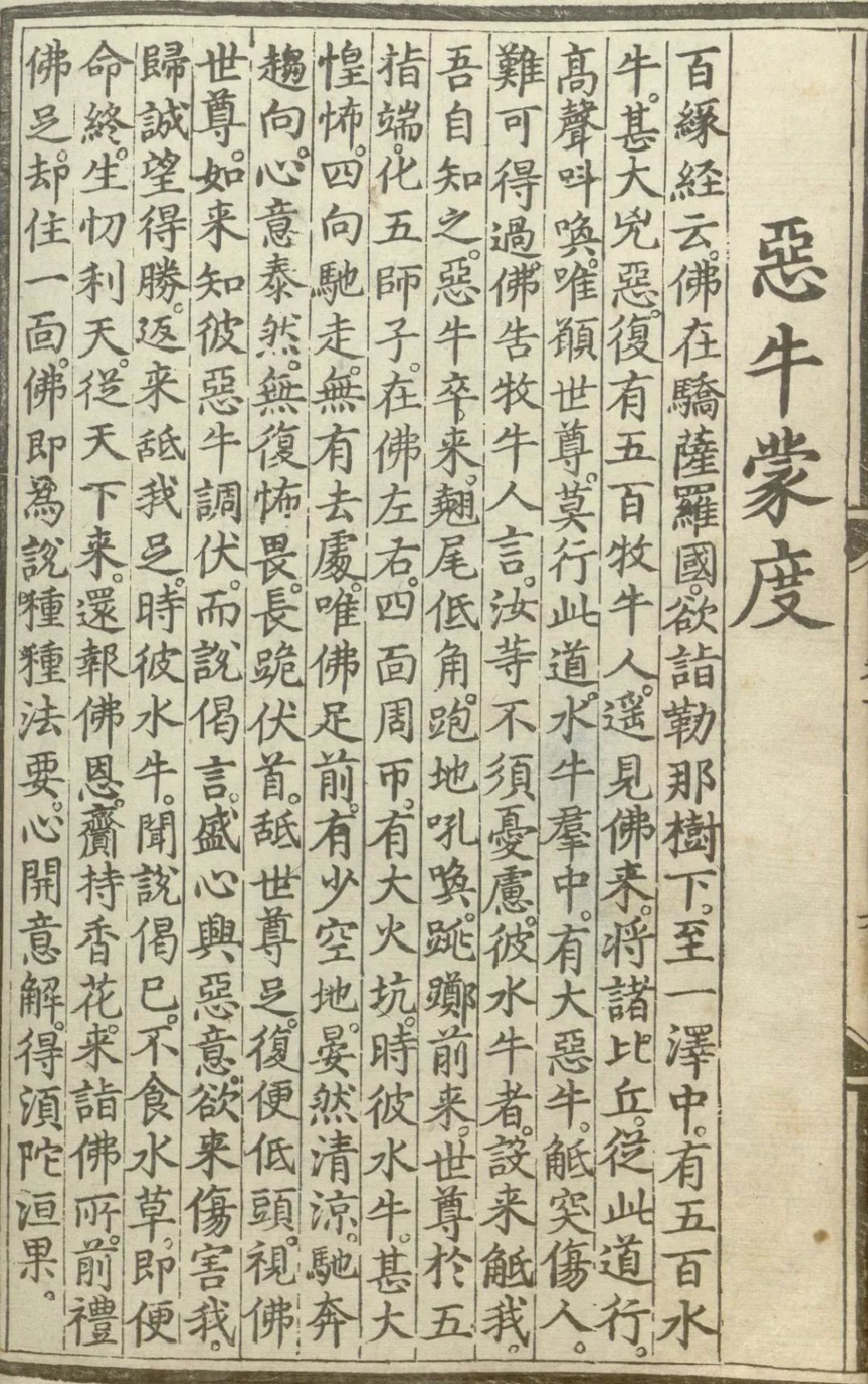 复有五百牧牛人。遥见佛来。将诸比丘。从此道行。高声叫唤。唯愿世尊莫行此道。水牛群中有大恶牛。鏁突伤人。难可得过。佛告牧牛人言。汝等不须忧虑。彼水牛者。设来鏁我。吾自知时。