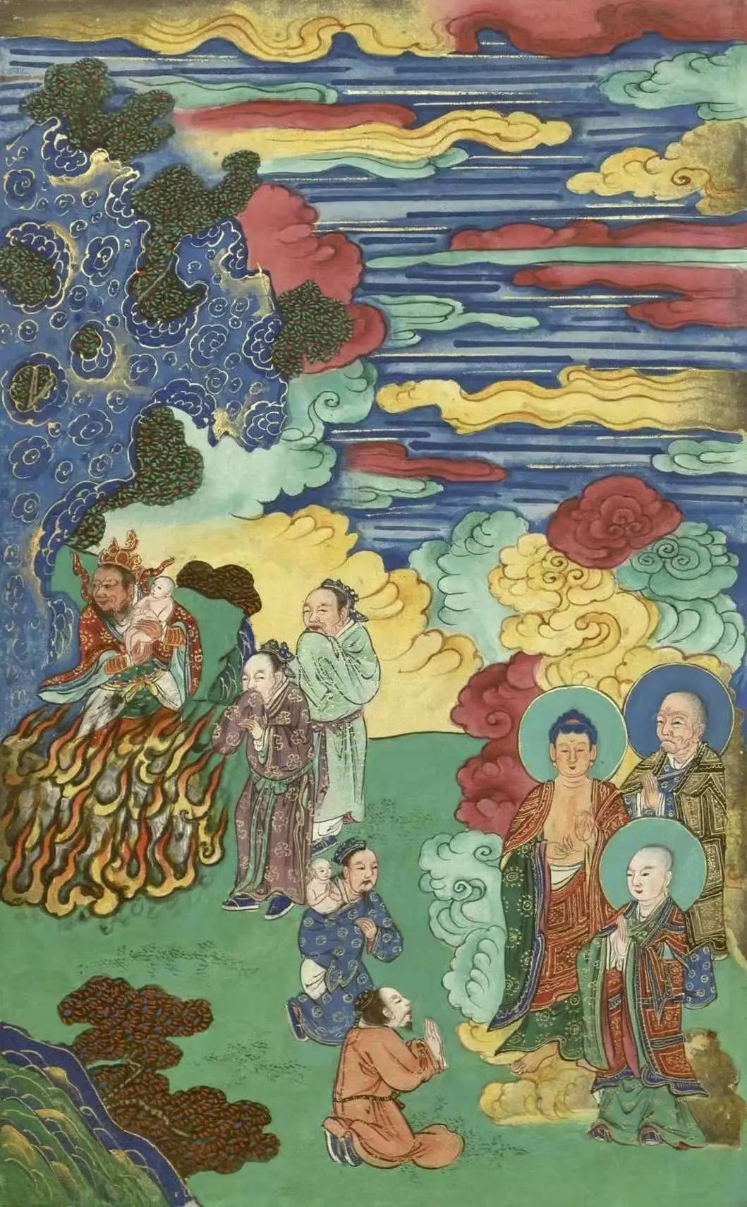这时,大火焚烧,死尸腹裂。佛对耆婆说:“你可往火中抱取婴儿。”耆婆入于火中,果然抱出婴孩,交付于佛。佛持付长者,并对长者说:“众生寿命不定,如水上泡。若是福厚之人,火不能烧,毒不能害。”