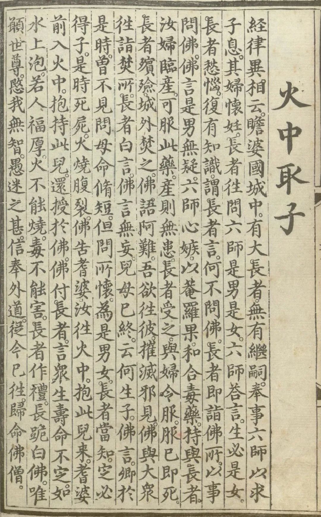 是时死尸火烧腹裂。佛告耆婆。汝往火中。抱此儿来。耆婆前入火中。抱持此儿。还授于佛。佛付长者言。众生寿命不定。如水上泡。若人福厚。火不能烧。毒不能害。