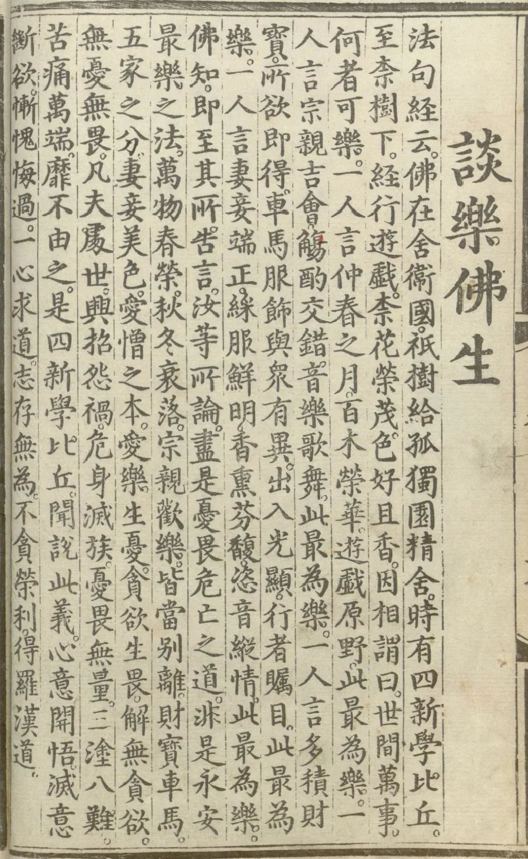 佛知这四位比丘在这里闲聊,谈得正欢,就走来对他们说:“你们刚才所论的,尽是忧畏危亡之事,哪谈得上是人间最乐!要知道,万物春荣,秋冬衰落;宗亲欢乐,皆当别离;财宝车马,五家(水、火、盗贼、官府、不肖子孙)之分;妻妾美色,爱憎之本。爱乐则生忧,贪欲则生畏。解无贪欲,无忧又无畏,凡夫处世,招灾惹祸,危身灭族,忧畏无量。三途八难,苦痛万端,无不由贪欲爱乐之故。”