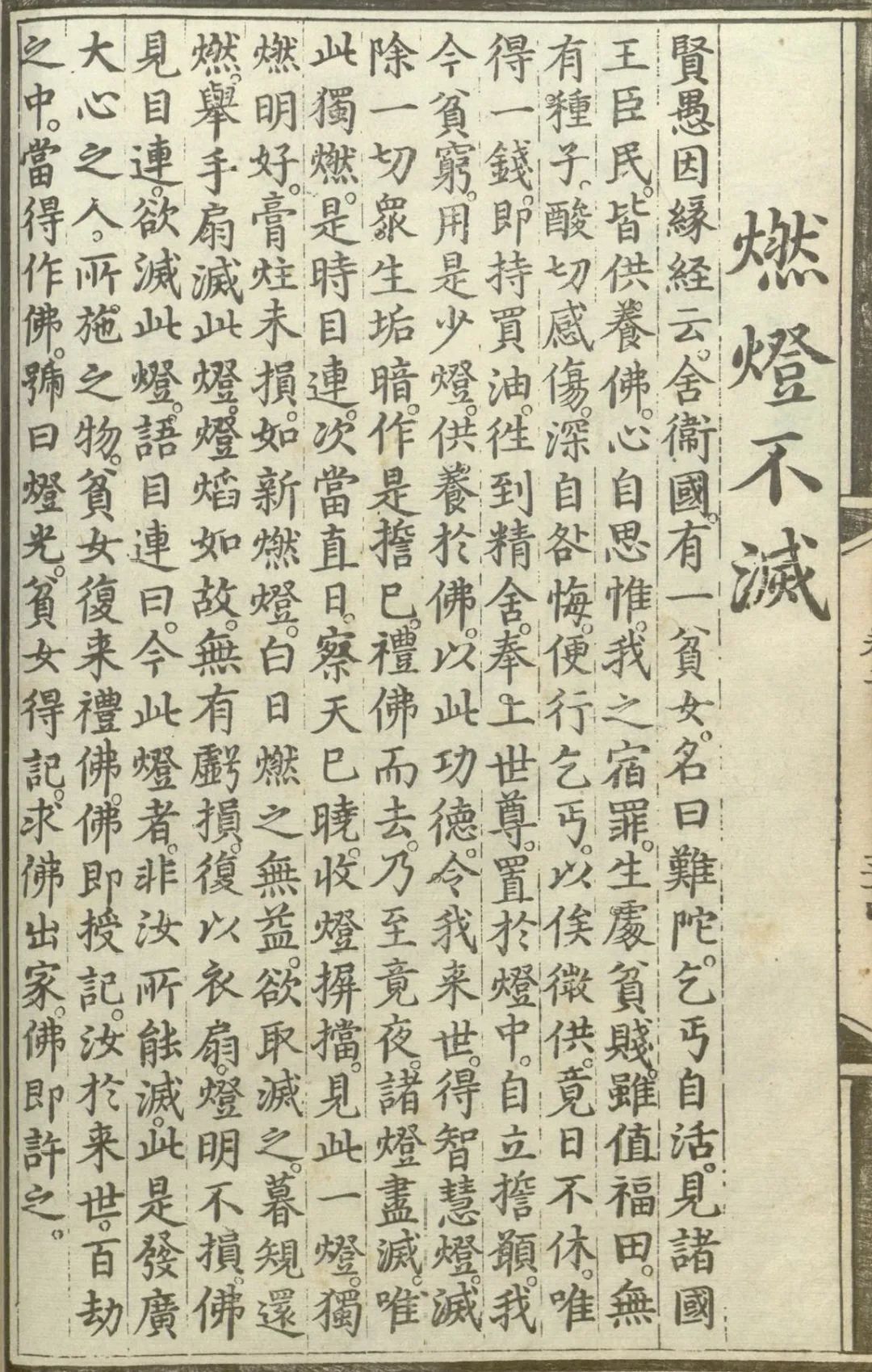 乃至竟夜。诸灯尽灭。唯此独燃。是时目连。次当直日。察天已晓。收灯摒挡。见此一灯。独燃明好。膏炷未损。如新燃灯。白日燃之无益。欲取灭之。暮规还燃。举手扇灭此灯。灯焰如故。无有亏损。复以衣扇。灯明不损。