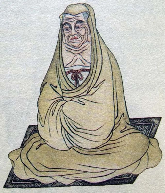 尊者法相所现为结跏趺坐,头戴斗篷,面容愁苦,双手笼于袖中。
